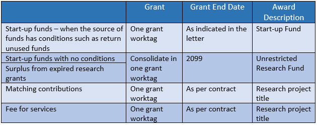A research grant worktag is created to facilitate accounting and reporting where needed with differentiating parameters as follows: